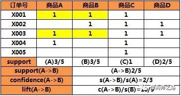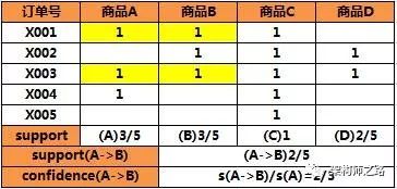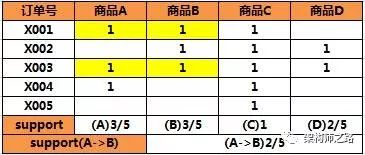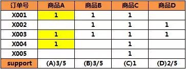 5笔订单,2笔同时包含AB,即A->B的支持度是2/5