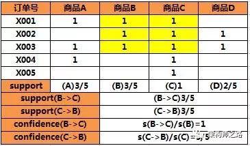 B->C的置信度是1,买商品B时,100%会买C