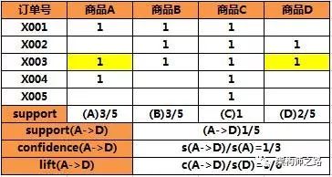• 3个订单购买A,这3个订单中有1个订单购买了D,所以A->D的置信度是1/3,即买了A1/3的概率会买D