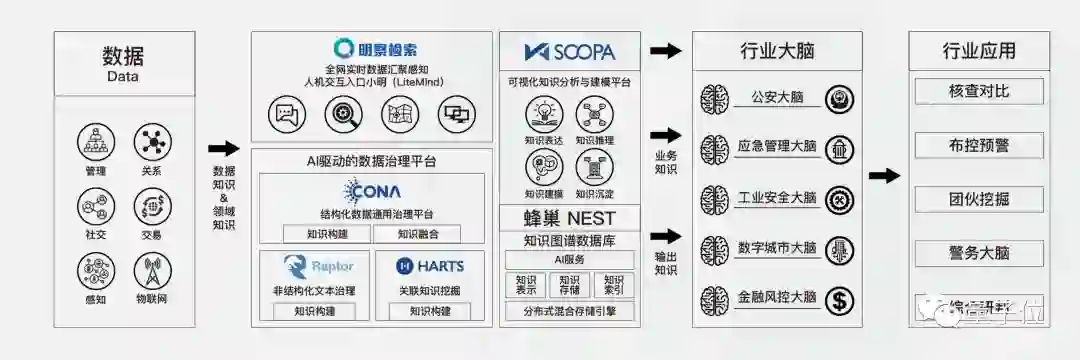 左边,是各种形式的数据,经过明略研发的各种产品工具和平台,最终实现准确、可靠的决策辅助的AI大脑,在行业的各个场景中部署应用。