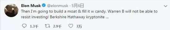 马斯克在之后的一条推特里表示:“我要建一条护城河,用糖果填满它。沃伦-巴菲特将无法抗拒投资!伯克希尔哈撒伟的氪……”