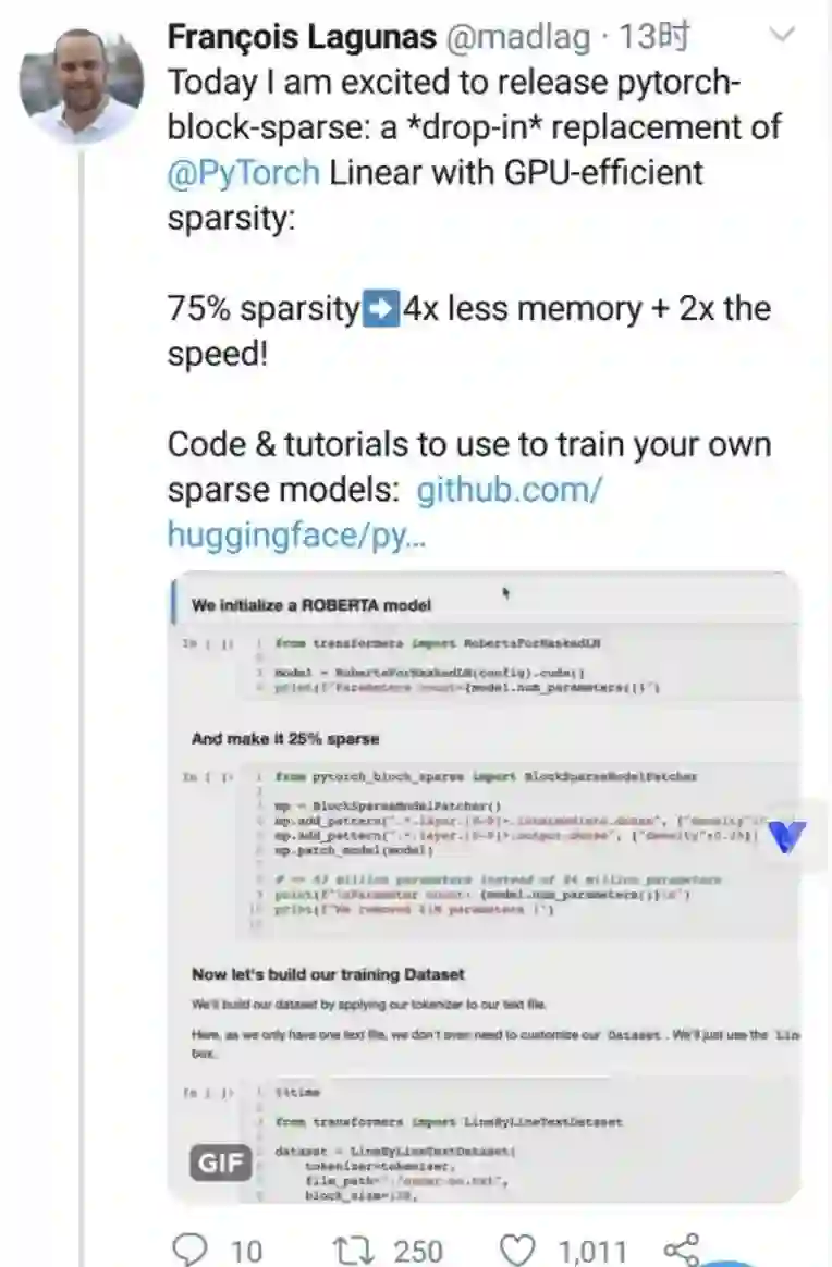 目前HuggingFace只迈出了一小步,后续CUTLASS还会继续提升,作者也会复现更多的学术成果。除了他们之外,OpenAI在20年初也宣布要将Tensorflow的部分计算代码移植到Pytorch,谷歌和斯坦福在6月的Paper Sparse GPU Kernels for Deep Learning[2] 也承诺会放出源码,大家可以把稀疏矩阵的优化学习提上日程啦。