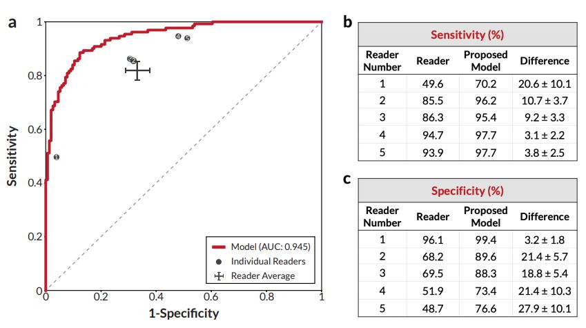 该研究提出的深度学习模型在131个“Index Cancer Exams”与154个确诊为阴性的病例中,均胜过5名放射科医师。