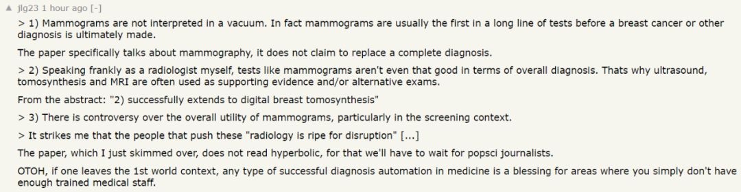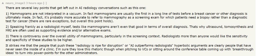 在另一个技术类资讯聚合网站Hecker News上,一位自称是放射科医生的网友认为这篇文章有点吹的太过,并对现在这类AI模型的趋势表示了担忧: