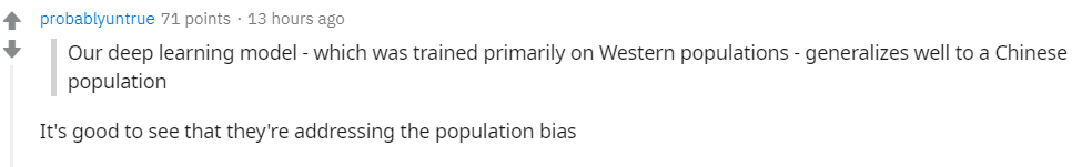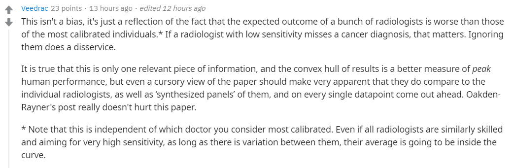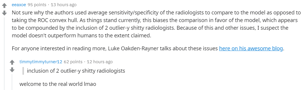 不过,由于本论文声称AI模型在诊断上战胜了全部5名人类放射科医生,这篇文章迅速引起网友关注,在Reddit上引发不少评论: