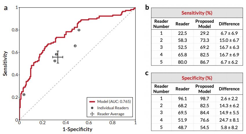 该研究提出的深度学习模型在癌症早期检测的任务中性能也优于5名放射科医师(该数据集包括120个“pre-Index Cancer Exams”(在“Index Exam”发现癌症之前的12-24个月临床上钼靶筛查的结果被解读为阴性)和154例确诊为阴性的检查)。