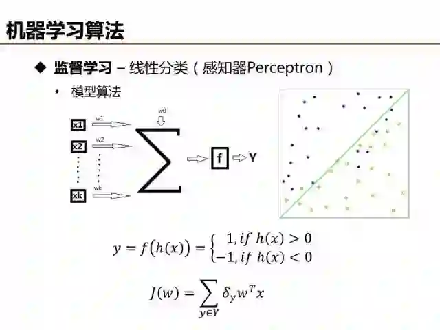 监督学习可分为分类和回归,感知器是最简单的线性分类器,现在实际应用比较少,但它是神经网络、深度学习的基本单元。