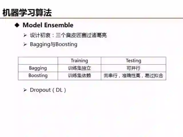 不同的数据任务场景,可以选择不同的 Model Ensemble 方法,对于深度学习,可以对隐层节点采用 DropOut 的方法实现类似的效果。