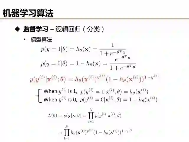 逻辑回归模型参数可以通过最大似然求解,首先定义目标函数 L ( theta ),然后 log 处理将目标函数的乘法逻辑转化为求和逻辑(最大化似然概率 -> 最小化损失函数),最后采用梯度下降求解。
