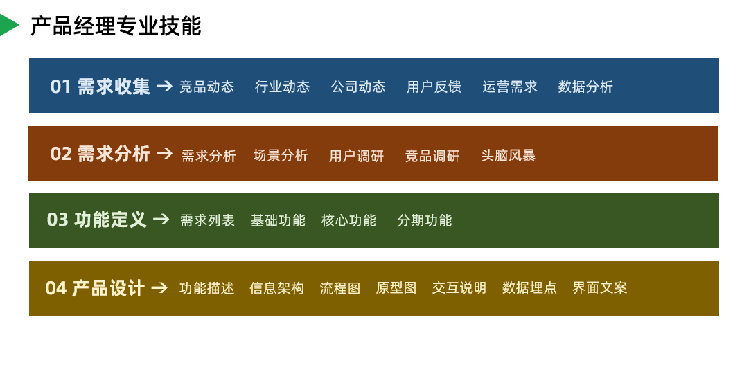 包含产品规划-用户调研,用户画像;产品设计-产品原型设计,需求文档编写;产品交付-项目管理,需求迭代等...