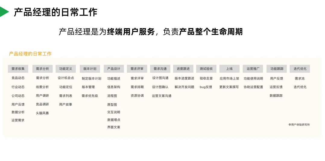 包含挖掘用户需求-需求分析,产品生命周期管理,定义产品功能,输出需求文档,原型图,各部门协调沟通,分析数据和用户反馈,改善用户体验,竞品分析等...