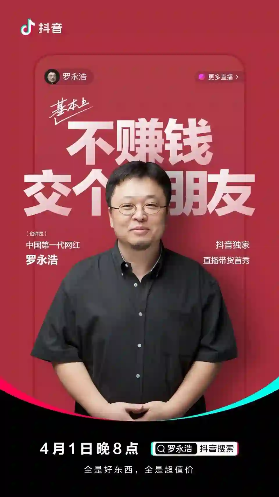 “作为硕果仅存的中国第一代网红,我将于 4 月 1 日晚 8 点在抖音示范直播带货。我们准备了很多好东西…基本上不赚你什么钱,就是交个朋友。看到日历,你会觉得这是愚人节,看到东西,你会觉得这不是愚人节,看到价格,你又会觉得这是愚人节,最后你会觉得…这TM到底是不是愚人节?”