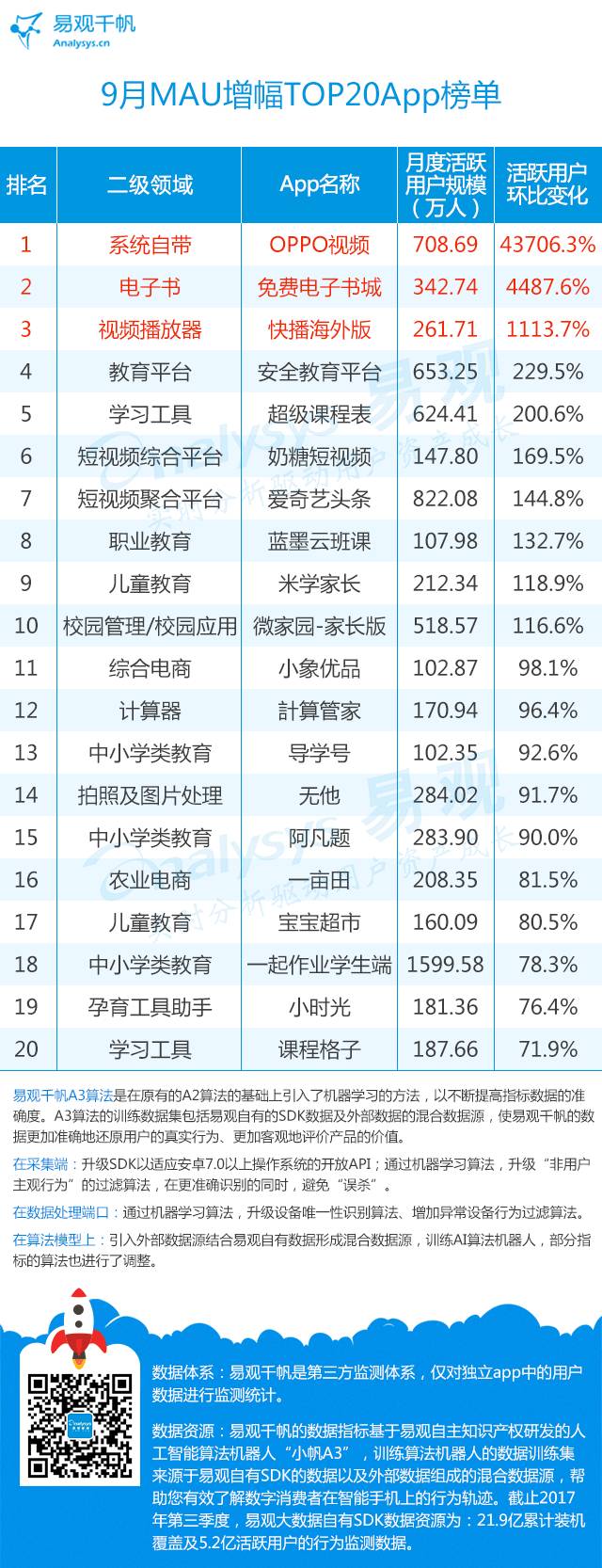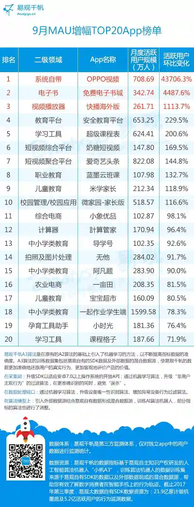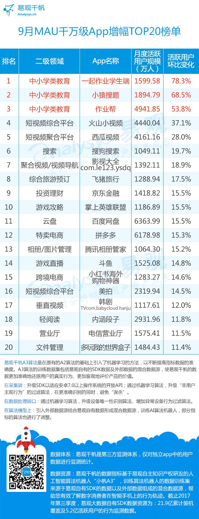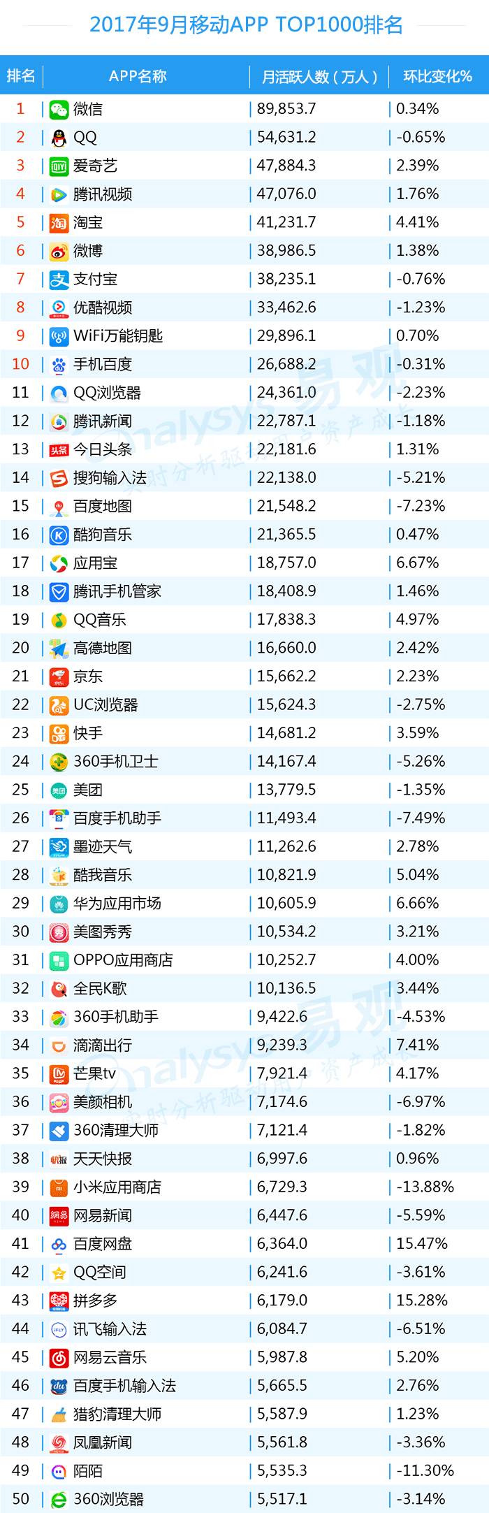 10月27日晚,一年一度的“易观之星”评选将再度揭晓,“年度最佳App”和“年度最具投资价值App”,及由大众评审选出“年度最受欢迎App”3大重量级奖项也将悉数公布,本期9月的App TOP1000排行榜,也是在“易观之星”奖项公布前的最后一次发布,究竟拼命一整年大家都将收获哪些成绩?我们也拭目以待。
