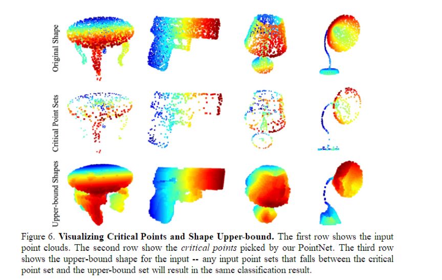 PointNet的实验是非常详细的,其中个人对其中一个实验非常感兴趣,就是输入网络中的所有的点只输出了一个1*1024的全局特征向量,所以说只有不到1024个关键点的特征使用到了,而论文对全局特征进行了反求,找出了是哪些关键点的特征这个构成了这个全局向量,并将这些点绘制了出来,如图6。