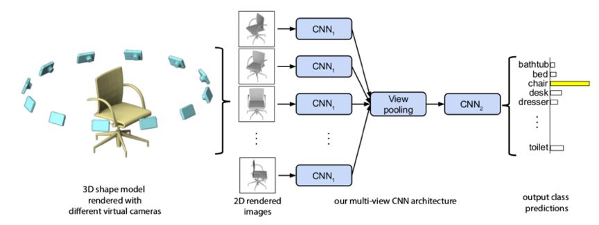 区别于体素化的方法,多视角图片在处理三维问题核心思想是,希望通过使用物体在不同视角下的图片来将三维物体的表面特征完整表示出来,接下来就可以直接使用现在非常成熟的2D CNN技术进行识别与检测。这种技术的思想想并不难理解,其实跟人眼分类物体的方法相似,如果在某一个角度无法正确对物体进行分类,那么我们可以换一个角度试着去进行分类,多视角的方法就是使用了这种思想。在这方面比较具有代表性的论文就是Multi-view CNN [3]。