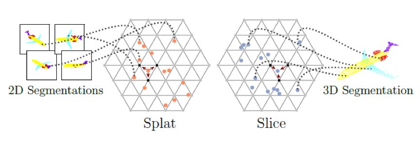 论文另一个吸引人的地方就是BCL2D->3D,可以将从多视图图像中提取的特征利用Permutohedral Lattice投射到三维空间,使得二维图像与点云以一种学习的方法结合在一起,论文也通过这种方法取得了非常好的语义分割性能。