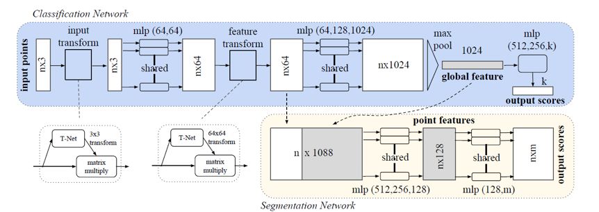图5就是PointNet的整体网络架构,整体的架构中主要使用了MLP层进行特征提取以及T-Net层进行空间变换,并且在求解全局特征(global feature)时使用对称函数g(max pool)。网络支持分类和分割任务,对于分类任务来说,就是输出整个点云的类别,而分割任务则是输出点云中每一个点的分类结果。PointNet在这两种任务中都取得了很好的结果。