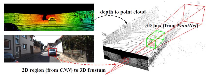 考虑到现在二维深度学习方向的技术已经非常成熟,同时使用RGB和点云信息在大规模三位物体定位中应该可以取得更好的成果,基于这个想法,Frustrum PointNet这篇文章就出现了。