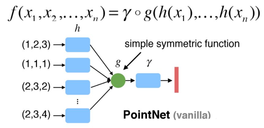 其中h是特征提取函数,在PointNet中就是MLP,g就是对称函数,可以是max、average等函数,在PointNet中用的是max函数,γ则代表的是网络更高层的特征提取函数。