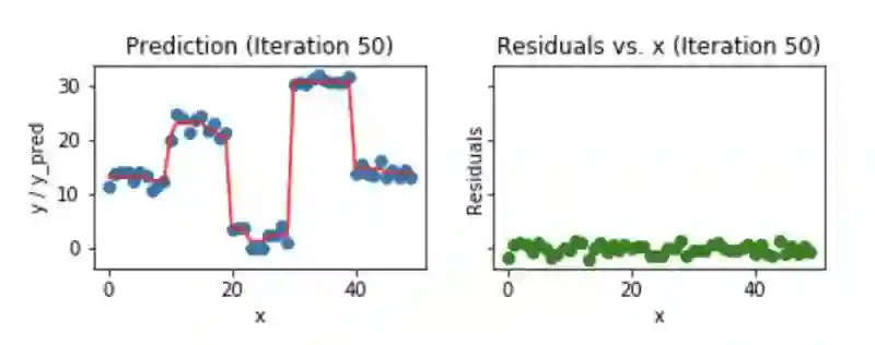 我们发现,即使是50个迭代之后,残差vs. x的图和我们看到的20个迭代的图也没太大区别。但是模型正在变的越来越复杂,预测结果在训练数据上出现了过拟合。所以,最好是在20个迭代的时候就停止。
