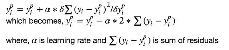所以,我们基本上是在更新预测,让残差的和接近于0(或者最小),这样预测的值就和实际的值足够的接近了。