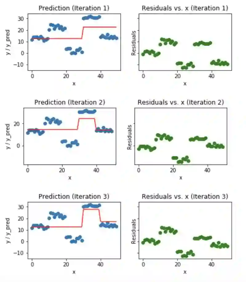 蓝色的点(左边)是输入(x),红色的线(左边)是输出(y)显示了决策树的预测值,绿色的点(右边)显示了第i次迭代的残差vs.输入(x),迭代表示拟合梯度提升树的了序列的顺序。
