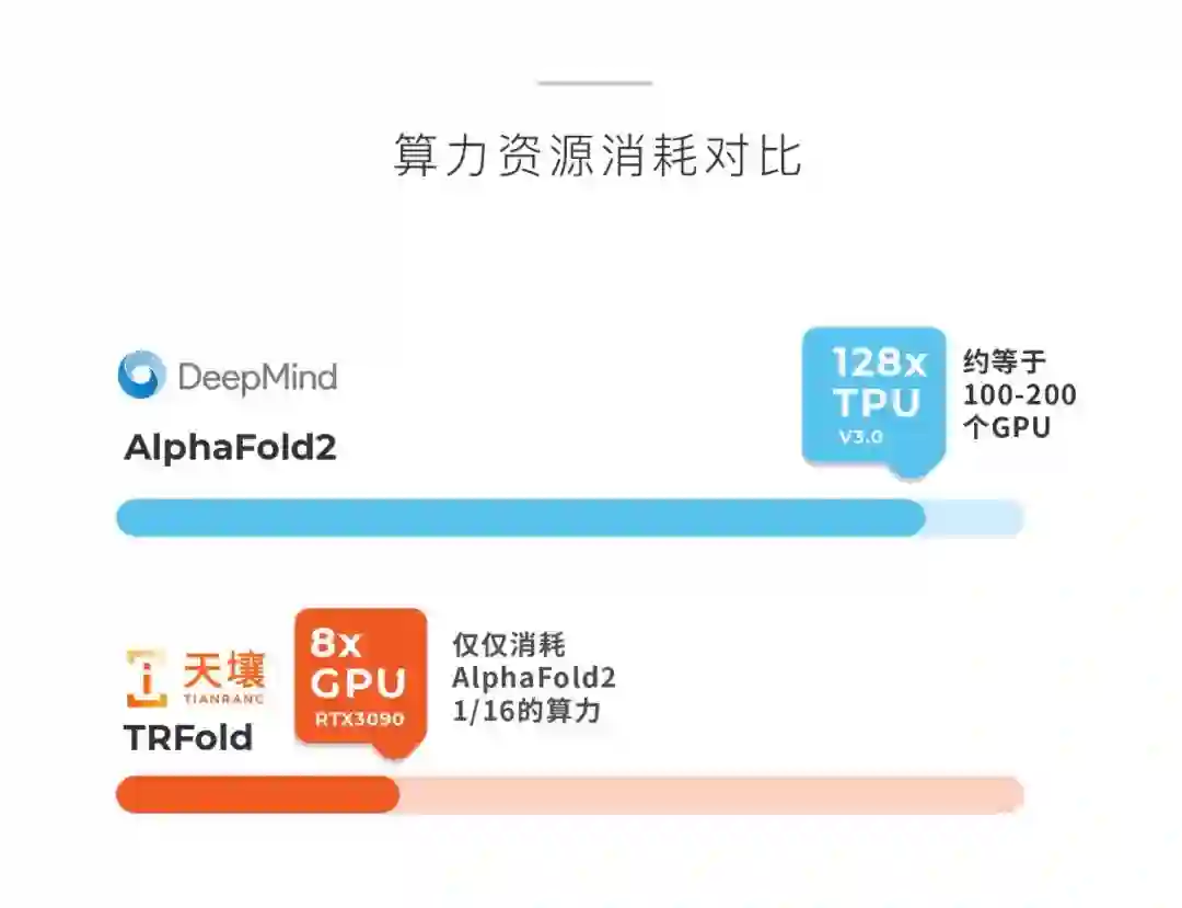 同时,对比 AlphaFold2 的 128 个 TPUv3 核心(相当于 256 块 GPU)算力配比,天壤的算法训练仅用 8 张 RTX3090。在预测约 400 个氨基酸的蛋白链时,AlphaFold2 需要 70 多秒;TRFold 16 秒即可完成,而且还是在只用一张 GPU 的情况下。