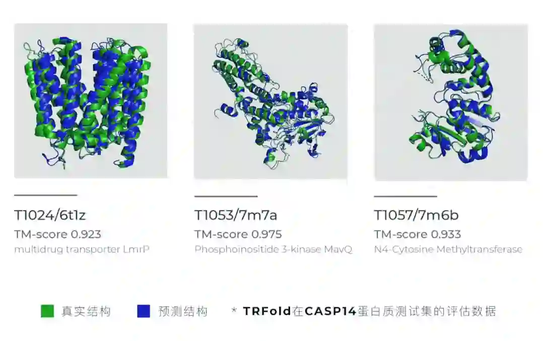 图示:对于单个蛋白的预测,TRFold 已经可以得到与 AlphaFold2 相媲美的结果。