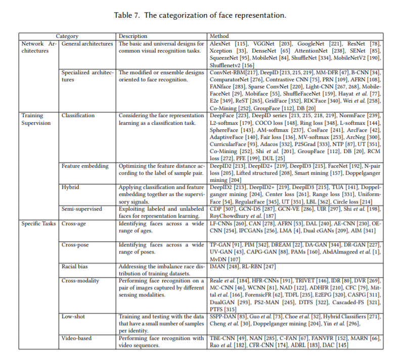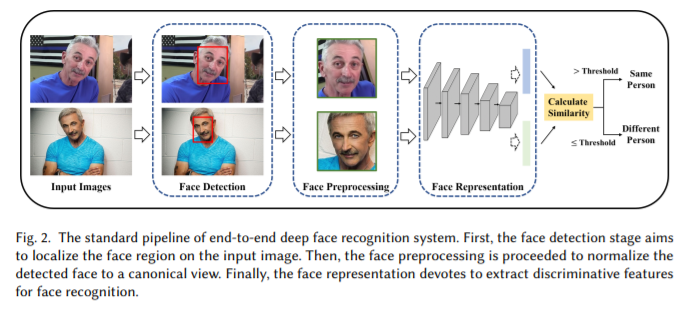 人脸识别是计算机视觉领域中最基本、最长期存在的研究课题之一。随着深度卷积神经网络和大规模数据集的发展,深度人脸识别取得了显著的进展,并在实际应用中得到了广泛的应用。以自然图像或视频帧作为输入,端到端深度人脸识别系统输出人脸特征进行识别。为了实现这一目标,整个系统通常由三个关键要素构建:人脸检测、人脸预处理和人脸表示。人脸检测在图像或帧中定位人脸。然后,对人脸进行预处理,将人脸标定为标准视图,并将其裁剪为标准化像素大小。最后,在人脸表示阶段,从预处理后的人脸中提取识别特征进行识别。深度卷积神经网络满足了这三个要素。摘要随着深度学习技术的蓬勃发展,端到端深度人脸识别技术的能力得到了极大的提高,本文对端到端深度人脸识别技术中各个方面的最新进展进行了综述。首先,我们介绍端到端深度人脸识别的概述,如前所述,它包括人脸检测、人脸预处理和人脸表示。然后,我们分别回顾了基于深度学习的每个元素的进展,包括许多方面,如最新的算法设计、评估指标、数据集、性能比较、存在的挑战和未来的研究方向。我们希望这一调查可以为我们更好地理解端到端人脸识别的大图和更系统的探索带来有益的想法。