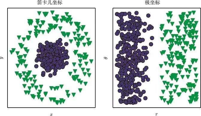 在左图中,我们使用笛卡儿坐标表示数据,这个任务是不可能的。在右图中,我们用极坐标表示数据,可以用垂直线简单地解决这个任务(与 David Warde-Farley 合作绘制此图)。