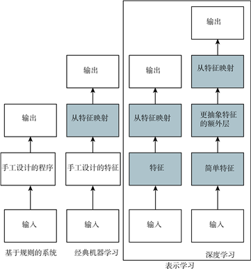 总之,这本书的主题 —— 深度学习是通向人工智能的途径之一。具体来说,它是机器学习的一种,一种能够使计算机系统从经验和数据中得到提高的技术。我们坚信机器学习可以构建出在复杂实际环境下运行的AI 系统,并且是唯一切实可行的方法。深度学习是一种特定类型的机器学习,具有强大的能力和灵活性,它将大千世界表示为嵌套的层次概念体系 (由较简单概念间的联系定义复杂概念、从一般抽象概括到高级抽象表示)。图 1.4 说明了这些不同的 AI 学科之间的关系。图 1.5 展示了每个学科如何工作的高层次原理。
