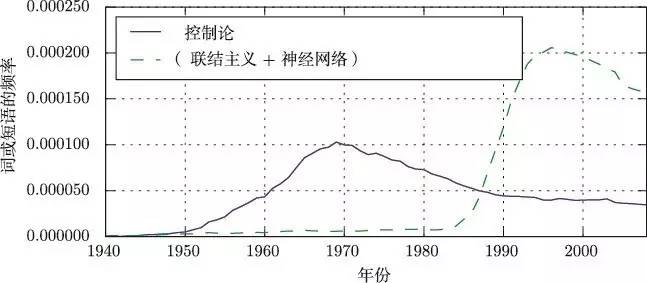 图 1.7 根据 Google 图书中短语“控制论”“联结主义”或“神经网络”频率衡量的人工神经网络研究的历史浪潮 ( 图中展示了 3 次浪潮的前两次,第 3 次最近才出现)。第 1 次浪潮开始于 20 世纪 40 年代到 20 世纪 60 年代的控制论,随着生物学习理论的发展 (McCullochand Pitts, 1943; Hebb, 1949) 和第一个模型的实现 (如感知机 (Rosenblatt, 1958)),能实现单个神经元的训练。