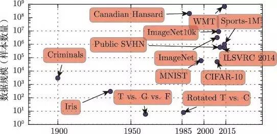 在 21 世纪的第一个 10 年里,相同大小更复杂的数据集持续出现,如 CIFAR-10数据集 (Krizhevskyand Hinton, 2009)。在这 10 年结束和接下来的 5 年,明显更大的数据集 (包含数万到数千万的样例) 完全改变了深度学习可能实现的事。这些数据集包括公共Street View House Numbers 数据集 (Netzer et al., 2011)、各种版本的 ImageNet 数据集 (Deng et al., 2009, 2010a; Russakovsky et al., 2014a) 以及 Sports-1M 数据集 (Karpathy et al., 2014)。在图顶部,我们看到翻译句子的数据集通常远大于其他数据集,如根据 Canadian Hansard 制作的 IBM 数据集 (Brown et al., 1990) 和 WMT 2014 英法数据集 (Schwenk, 2014)。