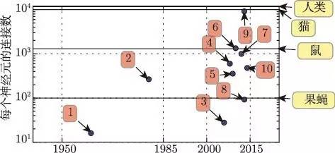 生物神经元不是特别稠密地连接在一起。如图1.10 所示,几十年来,我们的机器学习模型中每个神经元的连接数量已经与哺乳动物的大脑在同一数量级上。
