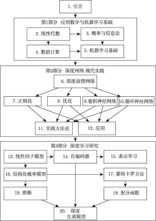读者可以随意跳过不感兴趣或与自己背景不相关的部分。熟悉线性代数、概率和基本机器学习概念的读者可以跳过第 1 部分。若读者只是想实现一个能工作的系统,则不需要阅读超出第2 部分的内容。为了帮助读者选择章节,图 1.6 给出了本书高层组织结构的流程图。