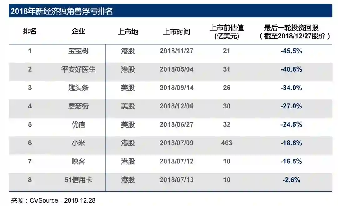 而一二级市场价格倒挂的反噬已经在一级市场体现得淋漓尽致,数据显示,2018年上市的几个主要的独角兽公司,最后一轮进入的一级市场投资者都处于持续“失血”状态。
