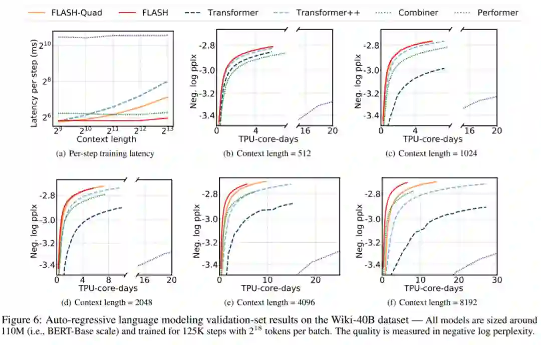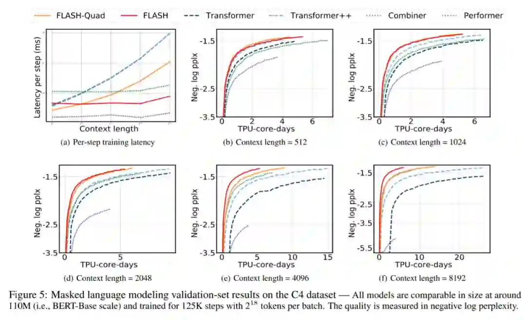 更重要的是,如图 5(b)-5(f) 所示,对于从 512 到 8192 的所有序列长度,Google AI 的模型总是在相同的计算资源下达到最好的质量(即最低的困惑度)。特别是,如果目标是在 125K step 匹配 Transformer++ 的最终困惑度,FLASH- Quad 和 FLASH 可以分别减少 1.1×-2.5× 和 1.0×-4.8× 的训练成本。值得一提的是,FLASH 是唯一一个与其二次复杂度对应物实现竞争性困惑度的线性复杂度模型。