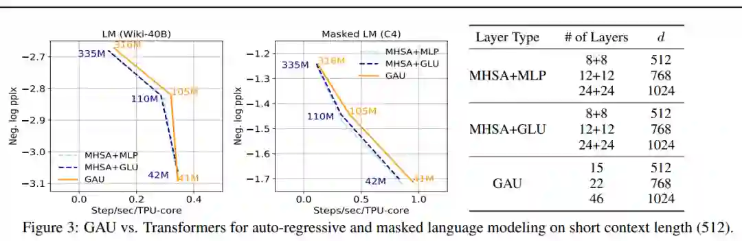 研究者在下图 3 中展示了 GAU 与 Transformers 的比较情况,结果显示对于不同模型大小,GAU 在 TPUs 上的性能可与 Transformers 竞争。需要注意,这些实验是在相对较短的上下文大小(512)上进行的。