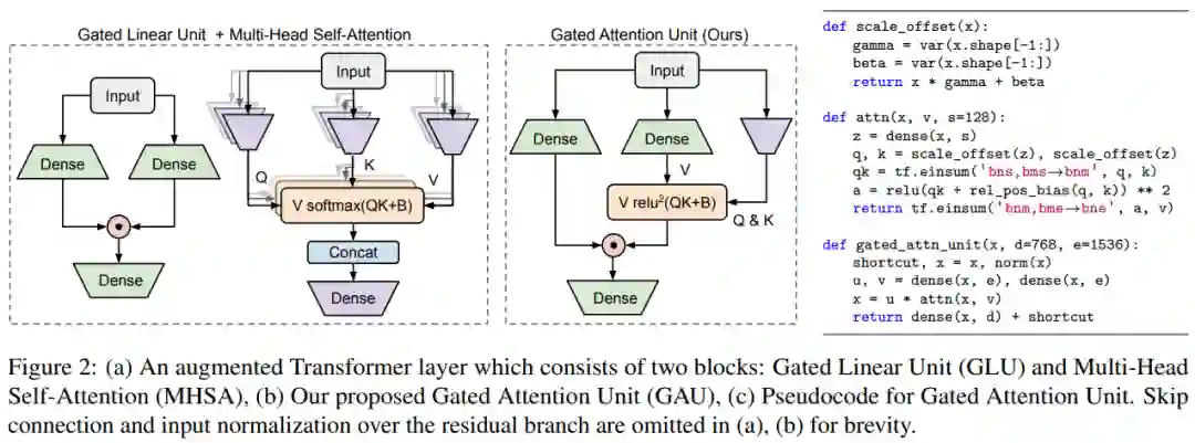 图 2 左为包含两个块的增强 Transformer 层,这两个块分别为门控线性单元(GLU)和多头自注意力(MHSA);图 2 中为研究者提出的门控注意力单元(GAU);图 2 右为 GAU 的伪代码。