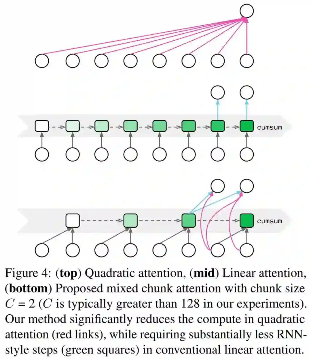 根据现有线性复杂度的优缺点,研究者提出了混合块注意力(mixed chunk attention),它融合了局部注意力和线性注意力的优点。下图 4 为二次注意力(Quadratic attention)、线性注意力和混合块注意力的构造比较。