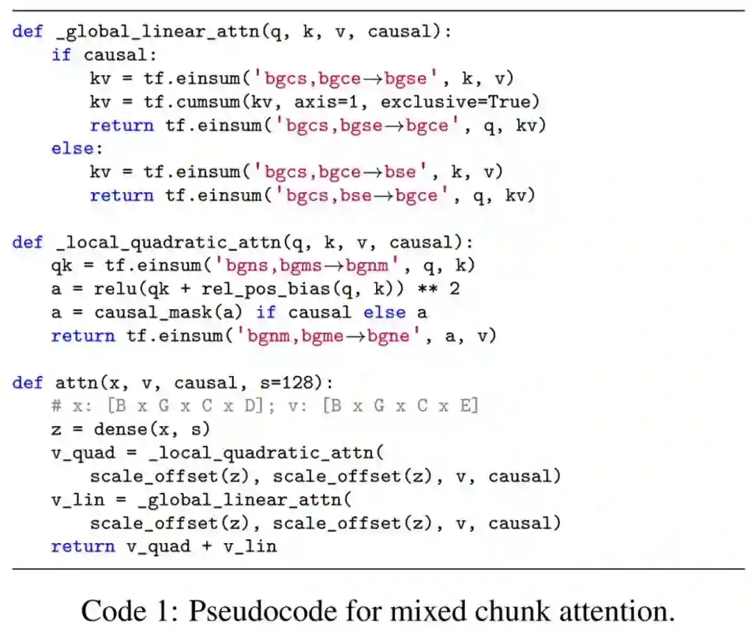 随后作者提出了一种有效的方法来逼近 GAU 中的二次注意力,从而导致在上下文大小上具有线性复杂度的层变体。其思路是首先将标记分组为块,然后在一个块内使用精确的二次注意力和跨块的快速线性注意力(如下图 4 所示)。在论文中,研究者进一步描述了如何利用此方法自然地推导出一个高效的加速器实现,在实践中做到只需更改几行代码的线性可扩展能力。