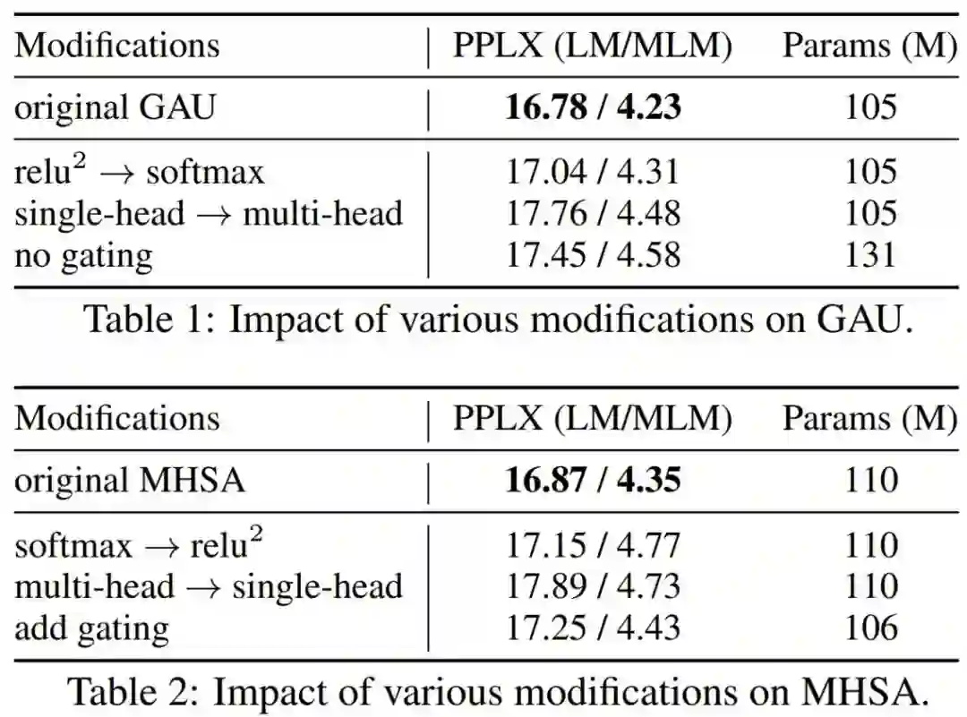 下表 1 和表 2 为层消融实验,结果显示 GAU 和 Transformers 各自都是局部最优的。