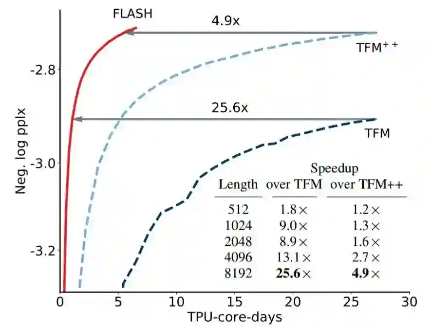 在大量实验中,FLASH 在各种任务、数据集和模型尺度上均效果很好。FLASH 在质量上与完全增强的 Transformer (Transformer++) 相比具有竞争力,涵盖了各种实践场景的上下文大小 (512-8K),同时在现代硬件加速器上实现了线性可扩展。