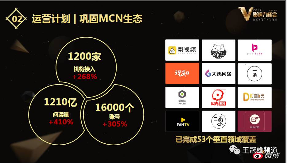 数据显示,截止目前,微博合作的MCN机构已超过1200家,较去年增长268%;共覆盖1.6万个帐号,较去年提升305%;月阅读量达1210亿,同比大幅提升410%。微博与MCN的合作已经覆盖到53个垂直领域,几乎涵盖微博用户所关注的所有兴趣领域。
