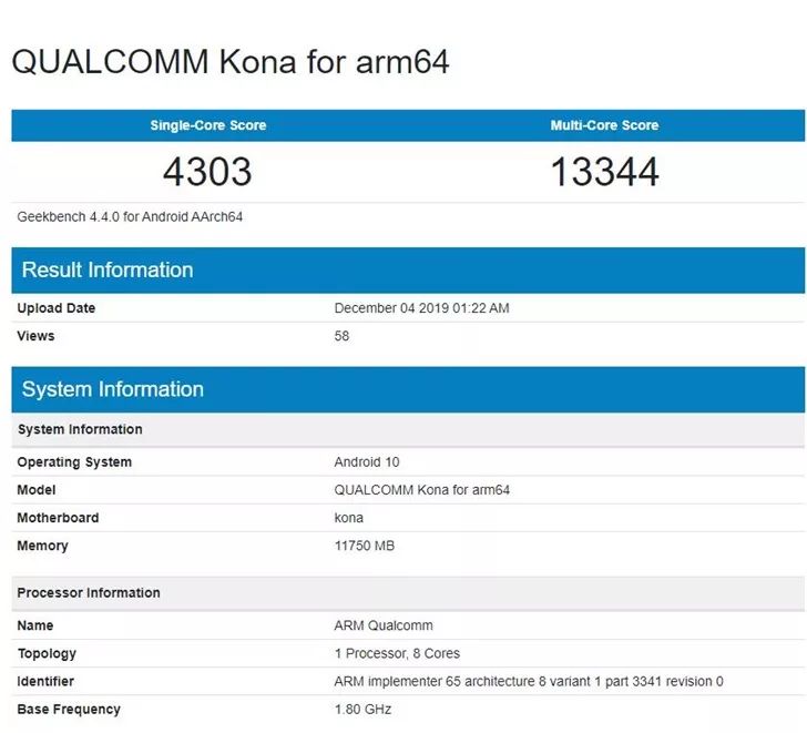 根据 GeekBench 4 公布的高通骁龙 865 工程机跑分显示,骁龙 865 单核 4303 分,多核 13344 分,成绩与麒麟 990 5G 的跑分(单核 3851 分、多核 12636 分)相比,单多核均略强一些;与骁龙 855 Plus(单核 3633 分、多核 11165 分)的跑分相比,单核性能略强,多核性能明显提升。由于是工程机,其单多核性能数据可能与真实性能略有差异。(小声bb:A13 单核 5482,多核 13694,分数仅供参考)