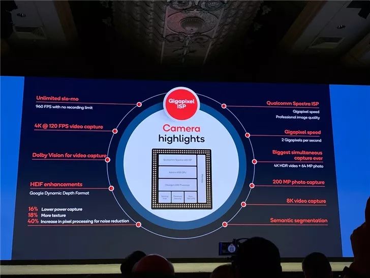 骁龙 865 的 ISP 处理速度高达惊人的每秒 20 亿像素,并支持全新的拍摄特性与功能。用户可以拍摄拥有 10 亿色的 4K HDR 视频,也可以拍摄 8K 视频,亦或捕捉高达 2 亿像素的照片。通过 960 fps 不限时高清慢动作视频拍摄,用户还可以充分利用十亿像素级处理速度来拍摄慢动作视频,捕捉每一毫秒的细节。