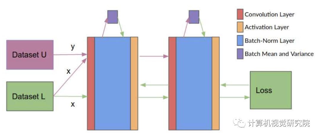 UBN的基础是首先更新批统计数据而不是权重。给定来自标记数据集L的批处理x∈L和来自未标记数据集U的批处理y∈U。第一步构建一个联合批处理n={x,y},并向前传递以更新normalization统计数据;第二步在使用x时进行forward-backward传递,并在前面的步骤中计算更新批归一化统计量。