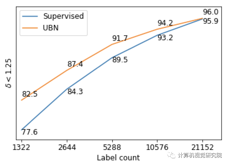 随着标记样本的数量收缩,UBN表现出越来越大的提升,并优于监督的BN训练。如果标记图像的数量接近未标记图像,这两种方法实际上变得相同,这使得新提出的方法更适合于标签有限的问题。