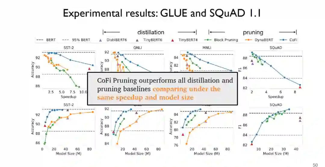 在实验阶段,在针对句子分类任务的GLUE数据集和针对问答任务的SQuAD1.1数据集上,可以发现CofiPruning在相同的速度和模型规模基础之上比所有的蒸馏和剪枝基线方法表现更好。