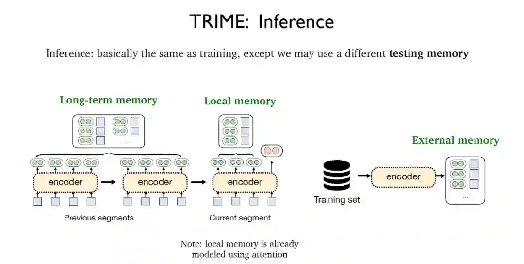 在于可能会采用不同的测试记忆,包括局部记忆(Local memory),长期记忆(Long-term memory)和外部记忆(External memory)。局部记忆指的是出现在当前片段中的所有单词,并且已经被注意力机制向量化;长期记忆指的是由于输入长度限制导致无法直接获取但与待处理文本来源于相同文档的文本表示,外部记忆指的是存储所有训练样本或者额外语料库的大型数据存储区。